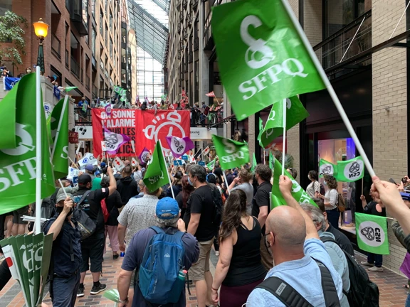 Dans le contexte où le gouvernement de François Legault s’entête avec des offres insuffisantes à l’endroit des centaines de milliers de travailleuses et de travailleurs des services publics, des organisations syndicales (CSN, CSQ, APTS, FTQ, SFPQ et SPGQ) ont perturbé, ce midi, les activités du Centre du commerce mondial, qui abrite notamment les ministères des Finances, du Commerce et de l’Enseignement supérieur. Elles ont sonné l’alarme pour les services publics en déployant, en plein cœur de l’édifice, des ballons d’hélium équipés de matériel sonore, créant ainsi un dérangement notable.